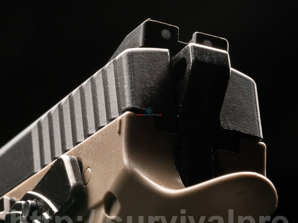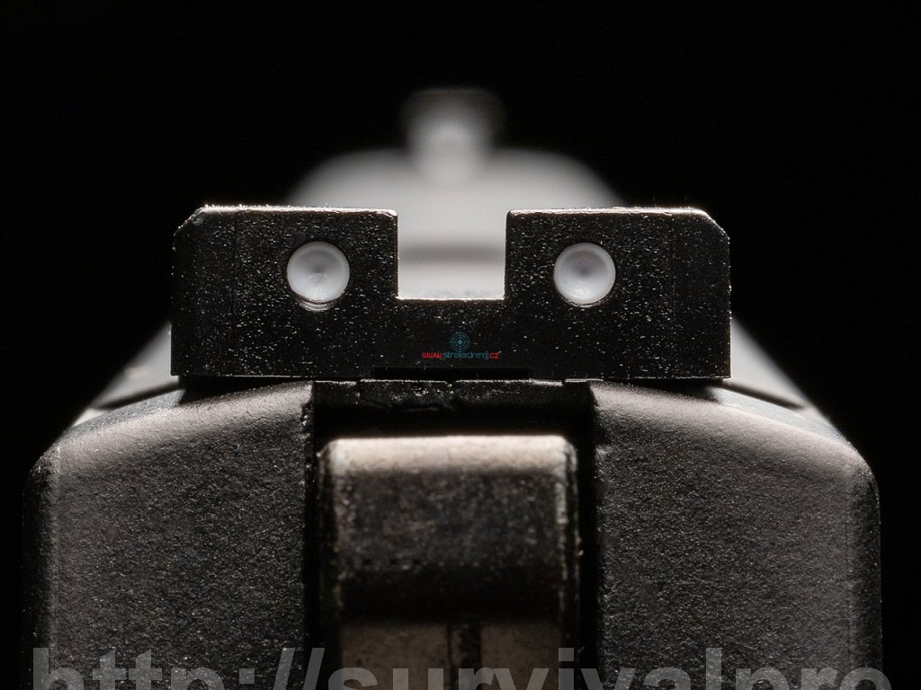 Mechaniczne przyrządy celownicze z podświetlanymi punktami świetlnymi są zamontowane na górze suwadła, aby ułatwić celowanie nie tylko w warunkach słabego oświetlenia. Na szkielecie przed belką znajduje się szyna montażowa 22 mm na laser, latarkę lub inne akcesoria taktyczne.