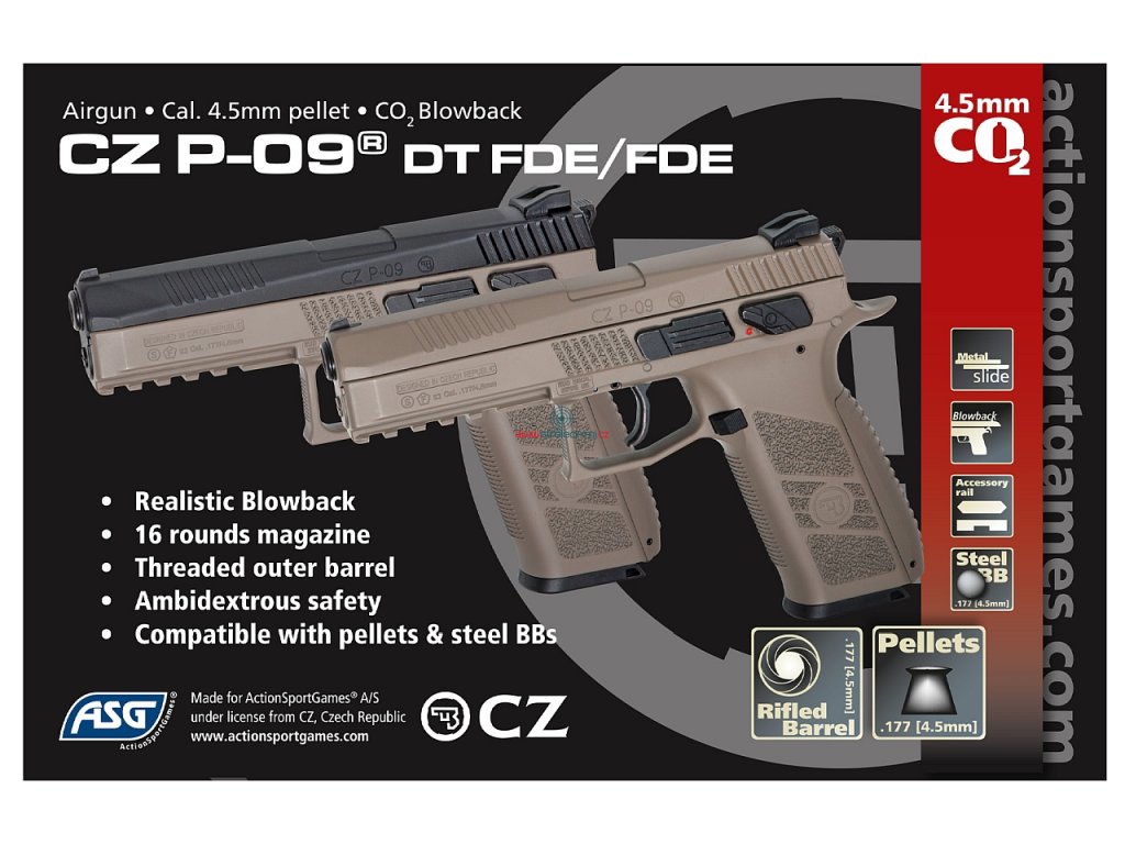SK P-09 Duty Bicolor Desert BlowBack w kalibrze 4,5 mm to wierna replika najwyższej klasy pełnowymiarowego pistoletu CZ P-09 w atrakcyjnym dwukolorowym wykończeniu. Duńska firma ASG, która jest producentem tego pistoletu CO 2, ma duże doświadczenie w produkcji zarówno airsoftu, jak i pistoletów pneumatycznych. Na czeskim rynku z powodzeniem zaistniała już lata temu dzięki wiernym replikom broni produkowanym przez Česká zbrojovka z Uhorskiego Brodu.