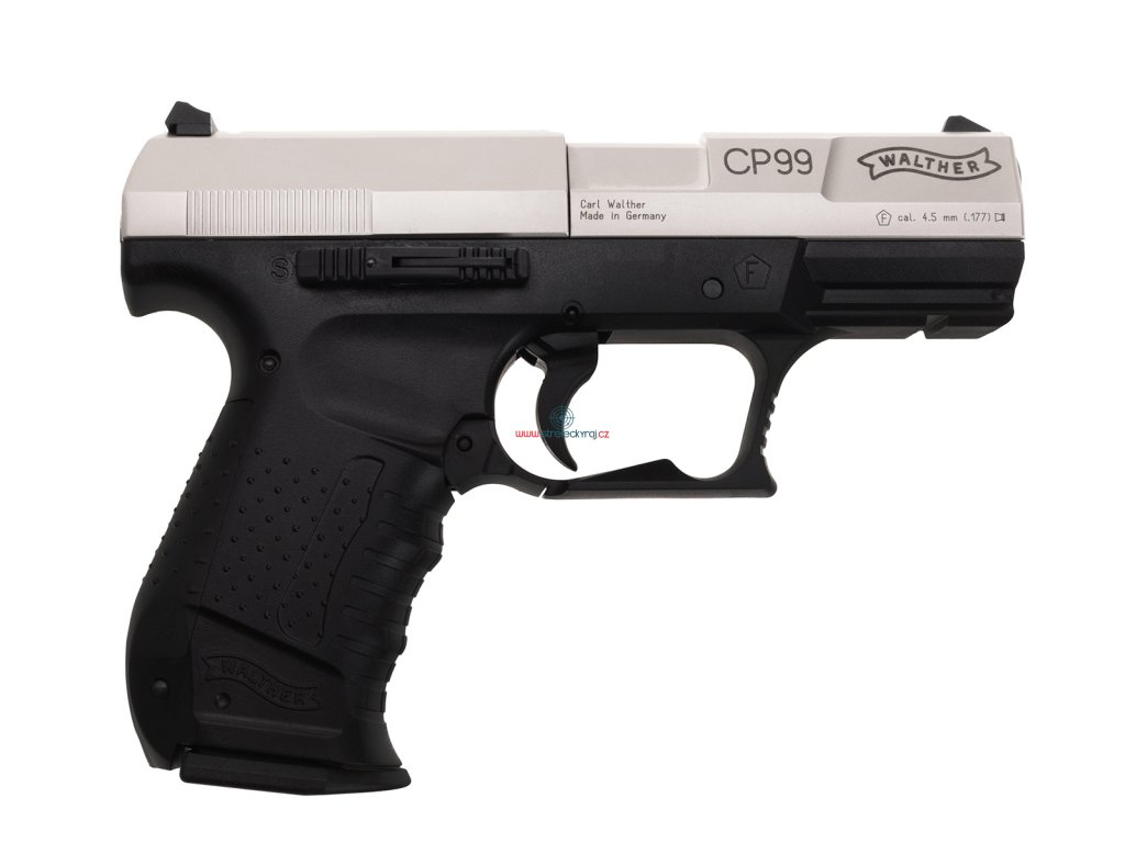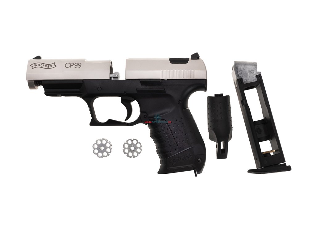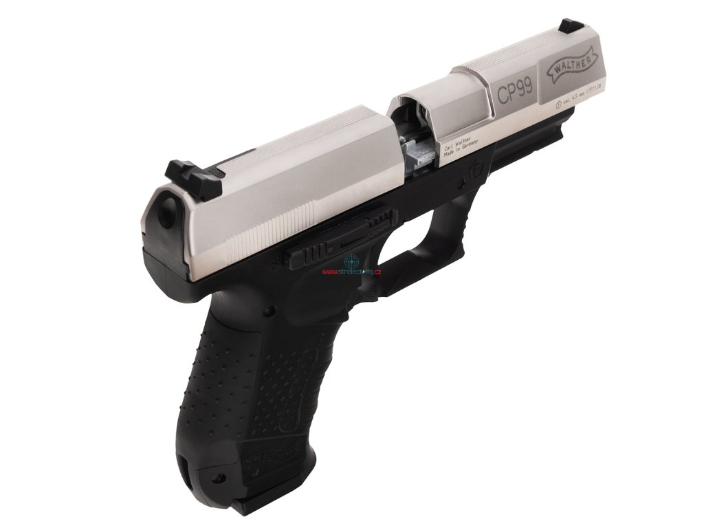 Walther CP99 w kalibrze 4,5 mm to wysokiej jakości replika CO2 pistoletu służbowego P99, produkowana przez Umarex na licencji tradycyjnej niemieckiej marki Walther. Ta wersja ma eleganckie niklowe wykończenie na zamku.
